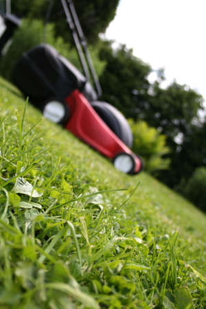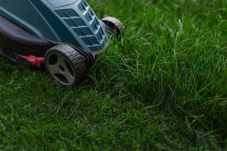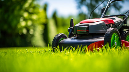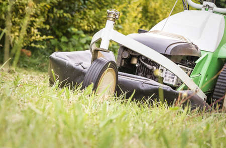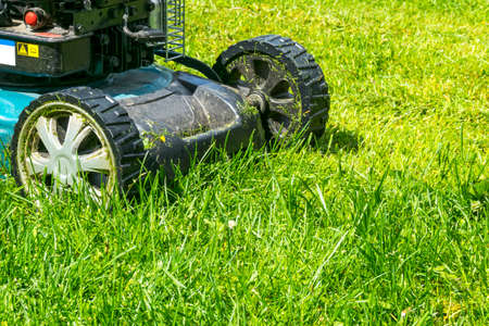 Mowing lawns, Lawn mower on green grass, mower grass equipment, mowing gardener care work tool, close up view, sunny day