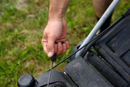 Garden worker checks a lawn mower before mowing grass in the backyard of a house