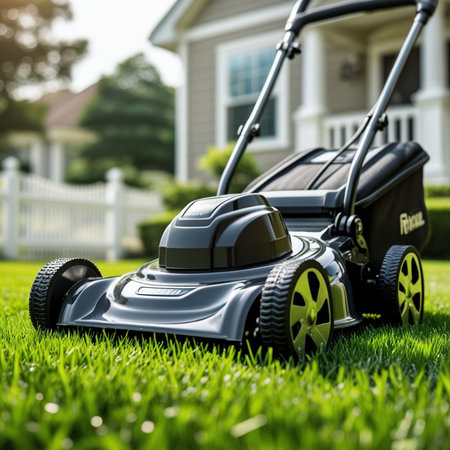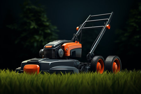 close-up of a lawn mower grass at sunrise, created with generative ai