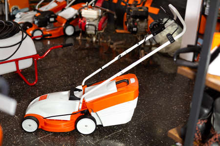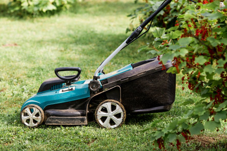 A lawn mover on green grass in modern garden. Machine for cutting lawns.