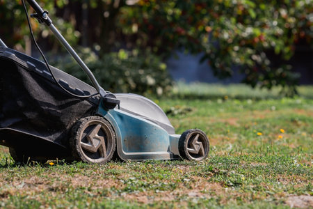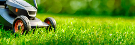 Electric lawn mower machine in garden on grass. Garden and lawn care theme. Banner format with copyspace