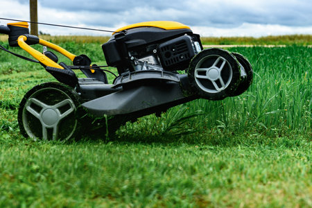Gasoline lawn mower cutting grass, close-up with copy space. Backyard care concept
