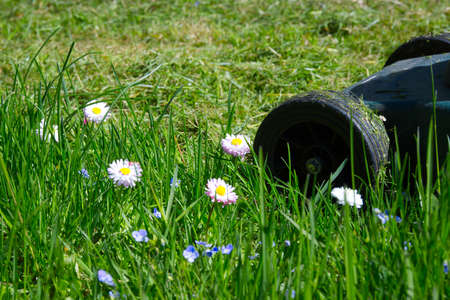 Lawn mower wheel on green grass before the white chamomile flower in the garden. Machine for cutting lawns. Cutting of meadow plants. Stop concept. Life moments. Vertical high quality photo.