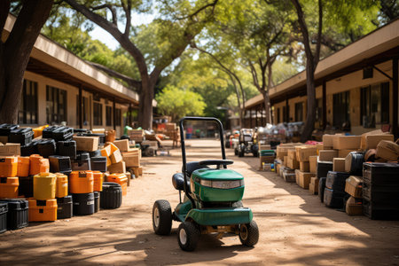 Electric lawnmower with hose reel on concrete floor in sunny day