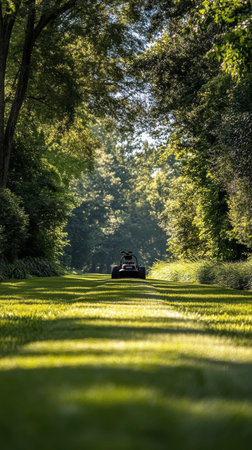A gardener mows a lush green lawn under the warm afternoon sunlight, showcasing the beauty of nature and outdoor maintenance in a serene environment.