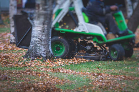 Removing fallen autumn leaves in the park, process of raking and cleaning the area from yellow leaves, regular seasonal work with tractor, garden tools and a modern equipment