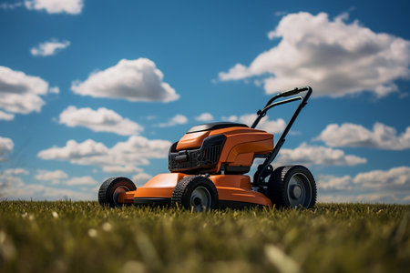 Vibrant Orange Lawn Mower Amidst Lush Green Grass and Sky. AI