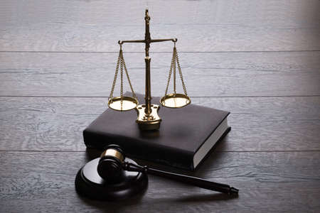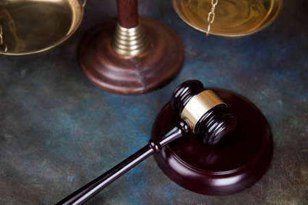 Law theme, mallet of the judge, justice scale, wooden desk background