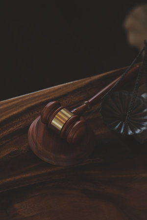 Judge antique gavel. Law symbols. Legal office. Wooden table and background.