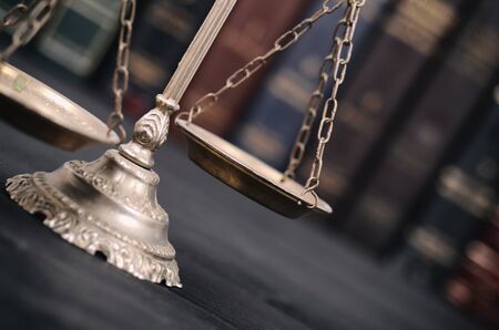 Law and Justice, Legality concept, Scales of Justice on a black wooden background.