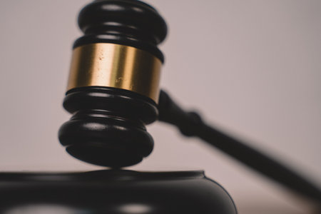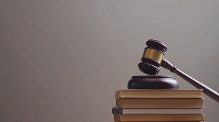 A golden gavel rests on a set of stacked legal books, bathed in soft light, representing the calm authority of law and justice in a serene environment. Perfect for legal themes.