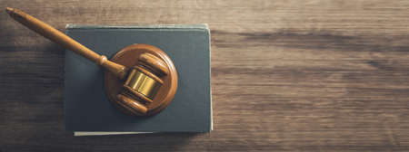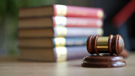 Law and justice theme. Mallet of judge. Legal code. Wooden table.