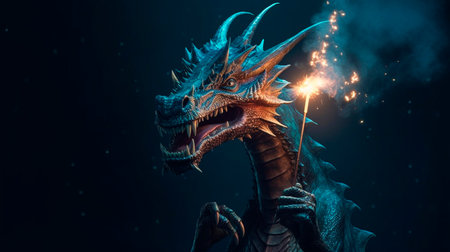 Dragon with sparkler on a dark background. new year concept. 3D visualization. Generative AI.