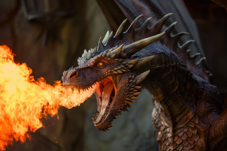 Detailed image of a dragon exhaling fire, perfect for fantasy themes