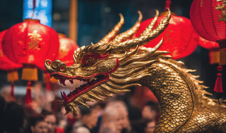 A golden dragon statue stands in front of red lanterns during a celebration