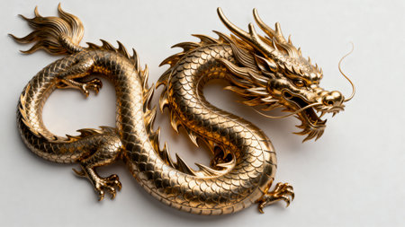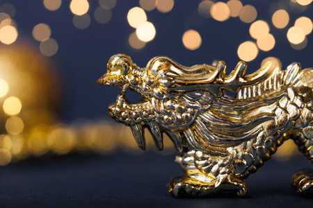 A close-up view of a golden dragon sculpture, showing intricate details and a sense of mythical power. The sculpture's scales, eyes, and teeth are vividly depicted, creating a captivating and dramatic image. The background is blurred with soft lights, adding to the mystique of the dragon.