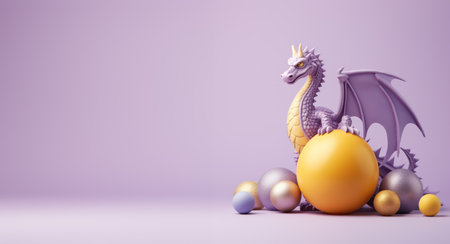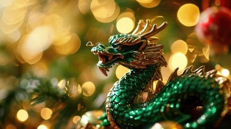 A small toy dragon is sitting on a table next to christmas decorations, AI