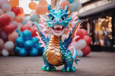 Dragon balloon sculptures in New Year street performance background with empty space for text