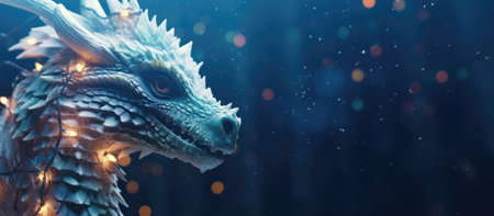 Blue dragon decorated with light garland on blue Christmas background with copy space.