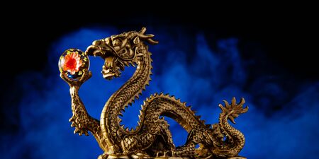 Chinese dragon in the temple at night with foggy background, China