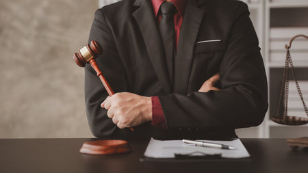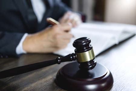 Gavel on wooden table and Lawyer or Judge working with agreement in Courtroom theme, Justice and Law concept.