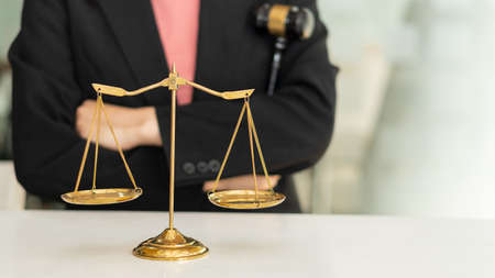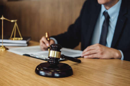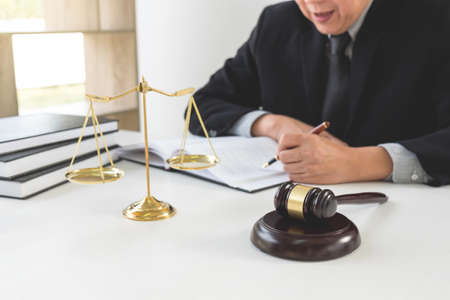 Professional man lawyers work at a law office There are scales, Scales of justice, judges gavel, and litigation documents. Concepts of law and justice.