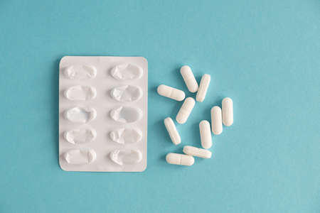 empty blister from under tablets and pills, capsules lie nearby on a blue background. Medication. Place for text.