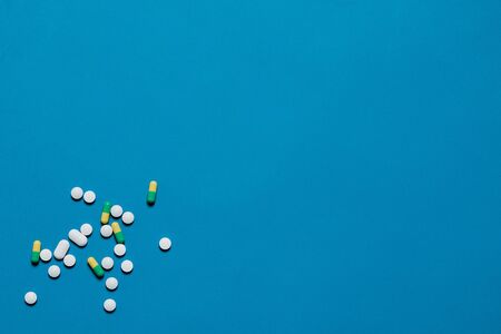 Various pills on the left side of the shot, isolated in blue background. Drugs for the virus and flu, tablets and capsules. Medicine and healthcare. Medical advertisement with copy space