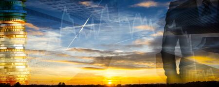 Double exposure of Business team meeting present. Photo professional investor working with new startup project.Digital tablet laptop computer with London architecture,building