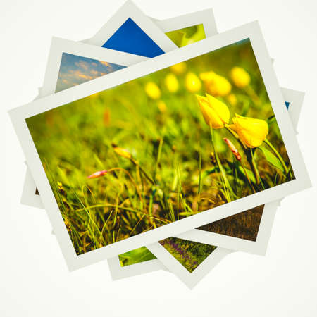 stack of photographs of nature in white frames on a white background. 3d render illustration