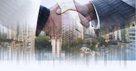 Mid section of two businessmen shaking hands over cityscape against technology background. global business and technology concept