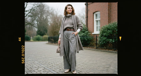 A close-up portrait of an individual dressed in eclectic grandpa style, standing against a backdrop that blends urban and vintage aesthetics. They wear a soft, patterned knit sweater, high-quality loafers, and classic trousers with a contemporary fit.