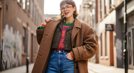 A stylish young woman with short hair, glasses, and a nose ring smiles in a city alley. She wears a layered outfit with a colorful knit sweater, a green vest, and a large brown wool coat.