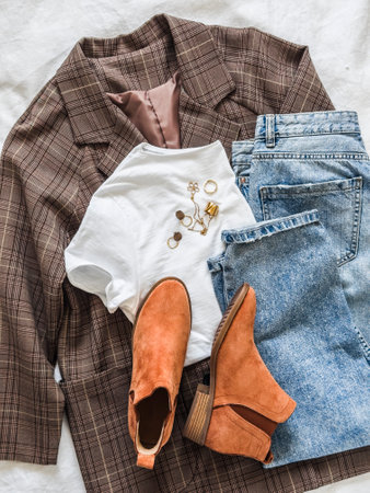 Women's clothing - plaid jacket, white t-shirt, jeans, chelsea on a light background, top view