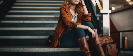 Fashionable young woman is sitting on the stairs in the airport.generative ai