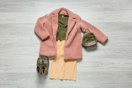 Set of stylish female clothes and accessories on wooden background
