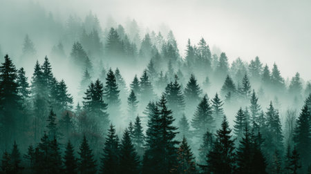This image showcases a tranquil forest scene, with layers of evergreen trees enveloped in a misty fog. The composition displays various shades of green, with subtle textures and a soft, diffused lighting effect. It suggests an outdoor environment, suitable for themes related to nature, environment, or general illustrative uses.