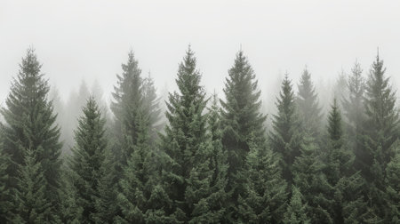 This captivating forest landscape features tall evergreen trees enveloped in mist, creating a tranquil atmosphere perfect for nature lovers and outdoor enthusiasts.