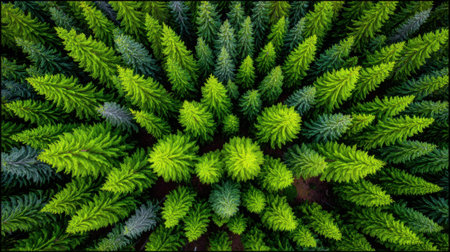 An overhead view reveals a dense forest canopy composed of numerous tall evergreen trees. The scene showcases a variety of green hues, with textures of needles and branches. The composition is framed by subdued lighting. The image suits commercial and editorial applications to depict nature or environment.