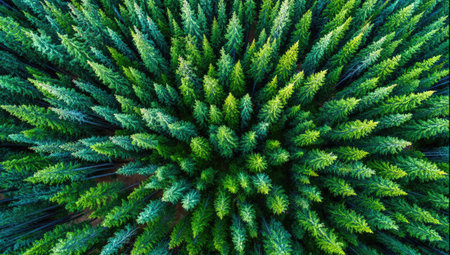 An overhead view reveals a dense forest, dominated by evergreen trees in various shades of green. The composition highlights the texture of the foliage and its layered arrangement. The style suggests a natural environment suitable for environmental concepts or background use, conveying a sense of serenity.