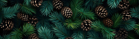 Fir branches and cones green needle abstract background Christmas texture. Horizontal composition, banner.