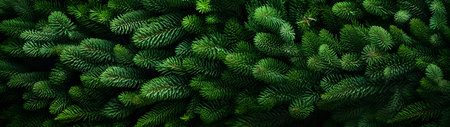 Fir branches green needle abstract background Christmas texture. Horizontal composition, banner.