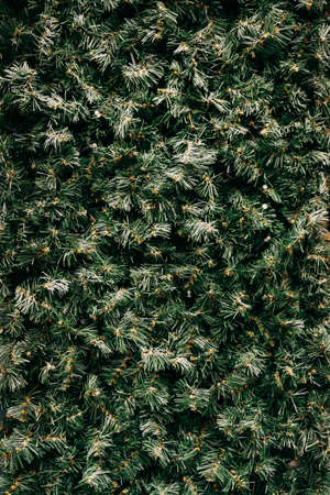 Fir branches texture pattern. Green background of pine branches. Christmas neutral background. Christmas tree branches with needles.