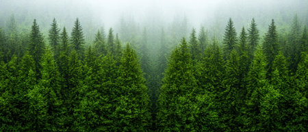 Low lying fog enveloping a lush evergreen forest creates a captivating and mysterious atmosphere in a panoramic nature scene, inviting a sense of tranquility and wonder