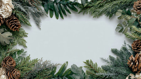 Frame of green pine branch isolated on white background and space for text. Top view of christmas fir tree branches and cones for decoration banner and New Year concept.