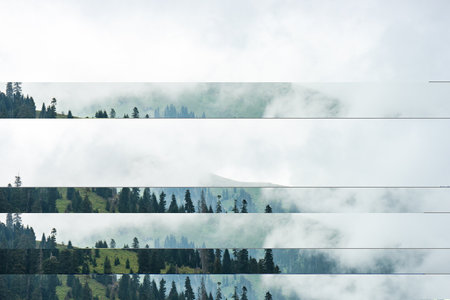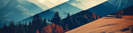 Composite image of pictures of alpine landscape with coniferous forest and mountains