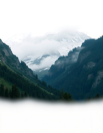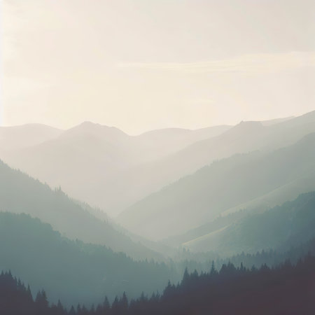 Layers of mist weave through rugged mountains as the early light softly illuminates the scene. Nature awakens in serene silence, showcasing delicate beauty and tranquil harmony.