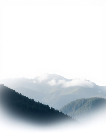 This serene image captures a misty mountain landscape, showcasing blue hills and a dense forest under an overcast sky, perfect for nature lovers and outdoor enthusiasts.