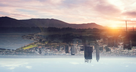 Majestic city skyline meets rugged mountain range in stunning double exposure art