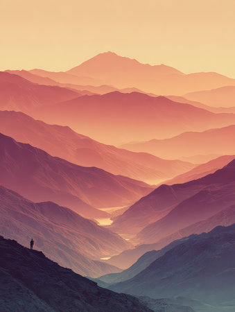 A stunning view of a mountain range at sunset, showcasing vibrant color gradients and a peaceful silhouette of a person. This serene landscape invites exploration.
